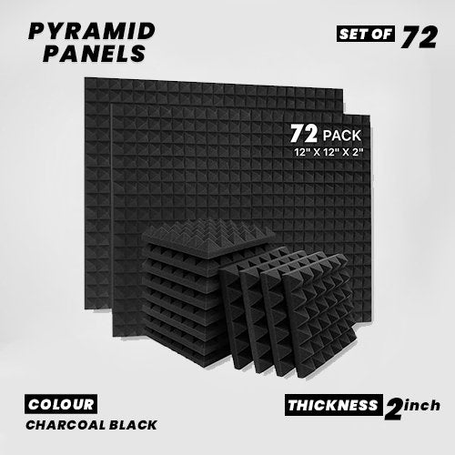 Pyramid Panels - Set of 72 | 1 Sqft, 2" Thick | 50 Density Studio Noise Reduction, Echo Absorption | Premium Grade | 3D Structure | Charcoal Black